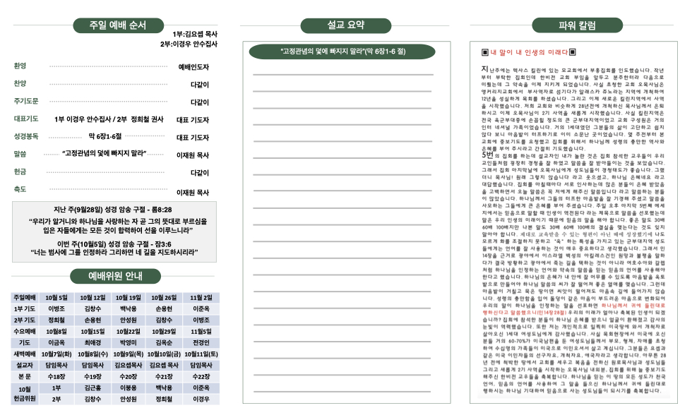 주보 10월5일 주보 Publish on October 08,2025 | 한비전교회 53 페이지 정보 작성자 한비전교회 댓글 0건 조회 53회 작성일 25-10-08 18:52 목록 본문 교회주보 다음글9월 28일 교회주보 25.09.27 댓글 0 댓글목록 등록된 댓글이 없습니다. 목록
