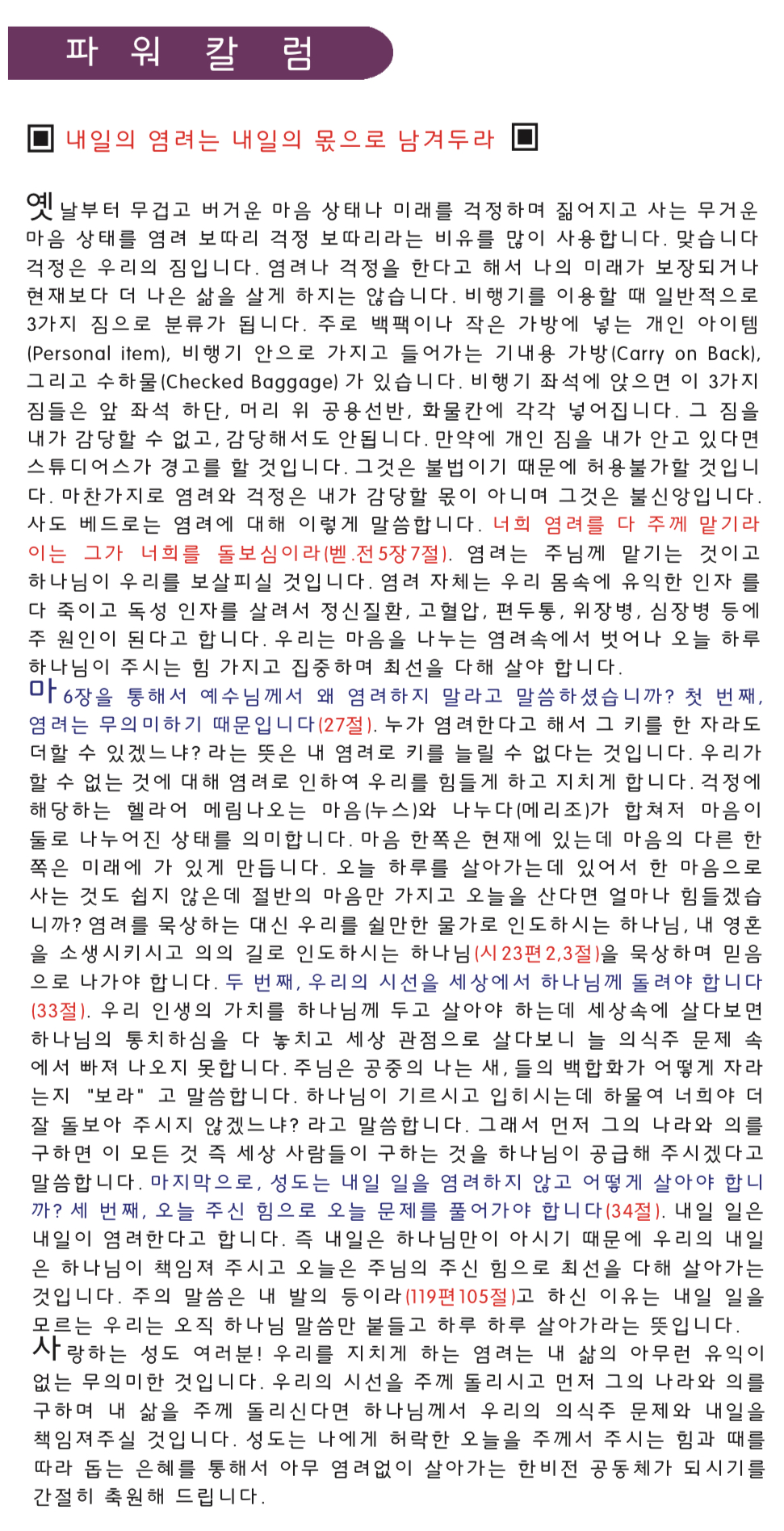 "내일의 염려는 내일의 몫으로 남겨두라" (10/22/2025) Publish on October 22,2025 | 한비전교회