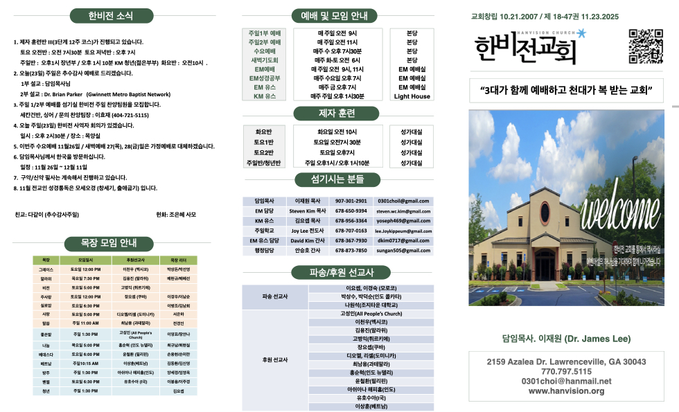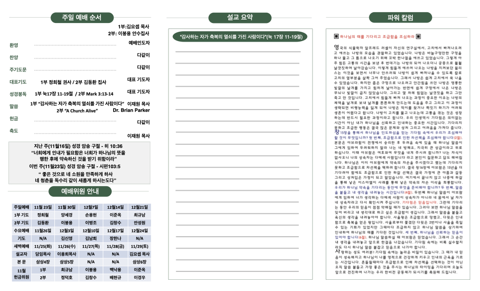 11월 23일 교회부조 Publish on November 22,2025 | 한비전교회 113 페이지 정보 작성자 한비전교회 댓글 0건 조회 113회 작성일 25-11-22 08:51 목록 본문 교회주보 이전글11월 30일 교회주보 25.11.28 다음글11월 9일 교회주보 25.11.08 댓글 0 댓글목록 등록된 댓글이 없습니다. 목록