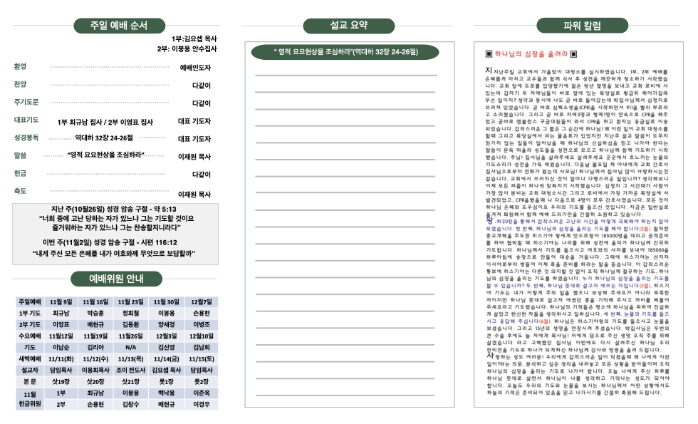 주보 11월 9일 교회주보 Publish on November 08,2025 | 한비전교회 8 페이지 정보 작성자 한비전교회 댓글 0건 조회 8회 작성일 25-11-08 07:58 목록 본문 교회주보 다음글11월 2일 교회주보 25.11.04 댓글 0 댓글목록 등록된 댓글이 없습니다. 목록