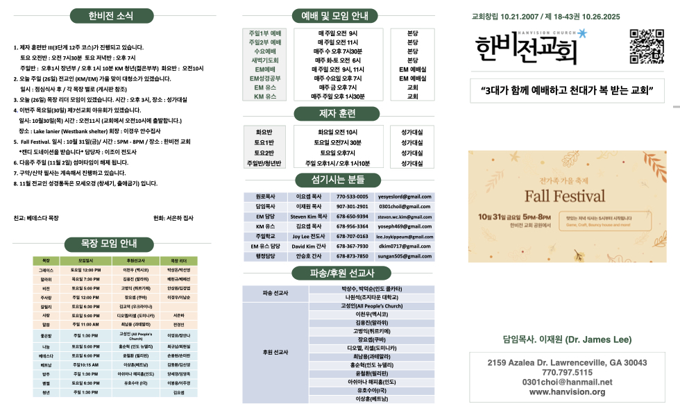 10월26일 주보 Publish on October 25,2025 | 한비전교회 79 페이지 정보 작성자 한비전교회 댓글 0건 조회 79회 작성일 25-10-25 15:26 목록 본문 교회주보 다음글10월 19일 주보 25.10.18 댓글 0 댓글목록 등록된 댓글이 없습니다. 목록