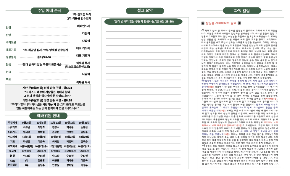 9월 28일 교회주보 Publish on September 27,2025 | 한비전교회 226 페이지 정보 작성자 한비전교회 댓글 0건 조회 226회 작성일 25-09-27 06:26 목록 본문 교회주보 이전글10월5일 주보 25.10.08 다음글9월 21일 주보 25.09.21 댓글 0 댓글목록 등록된 댓글이 없습니다. 목록